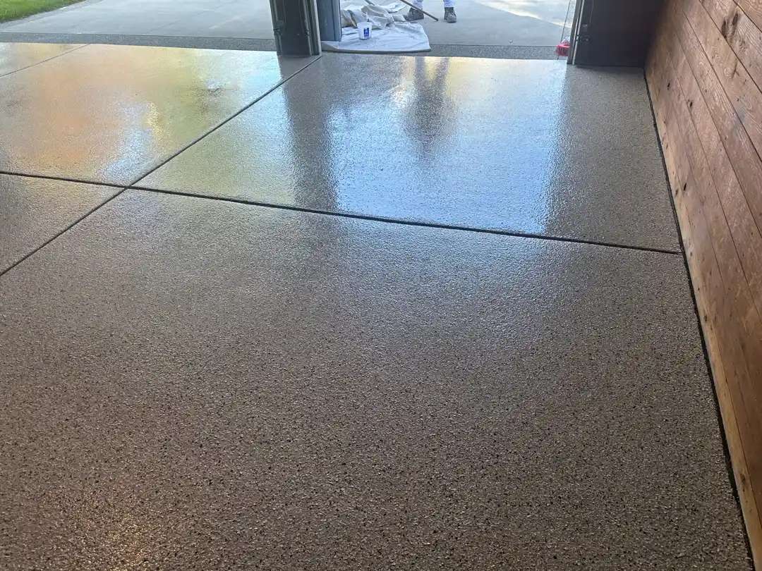 The gray base color was specifically selected to complement the Silver Creek decorative flake blend, creating depth and visual richness. The team applied base coat using professional-grade roller techniques, working material into the concrete surface profile while maintaining a consistent film thickness. We paid particular attention to the areas we had repaired. This ensured full coverage over mender-filled cracks and pits without differential absorption creating color variation.
