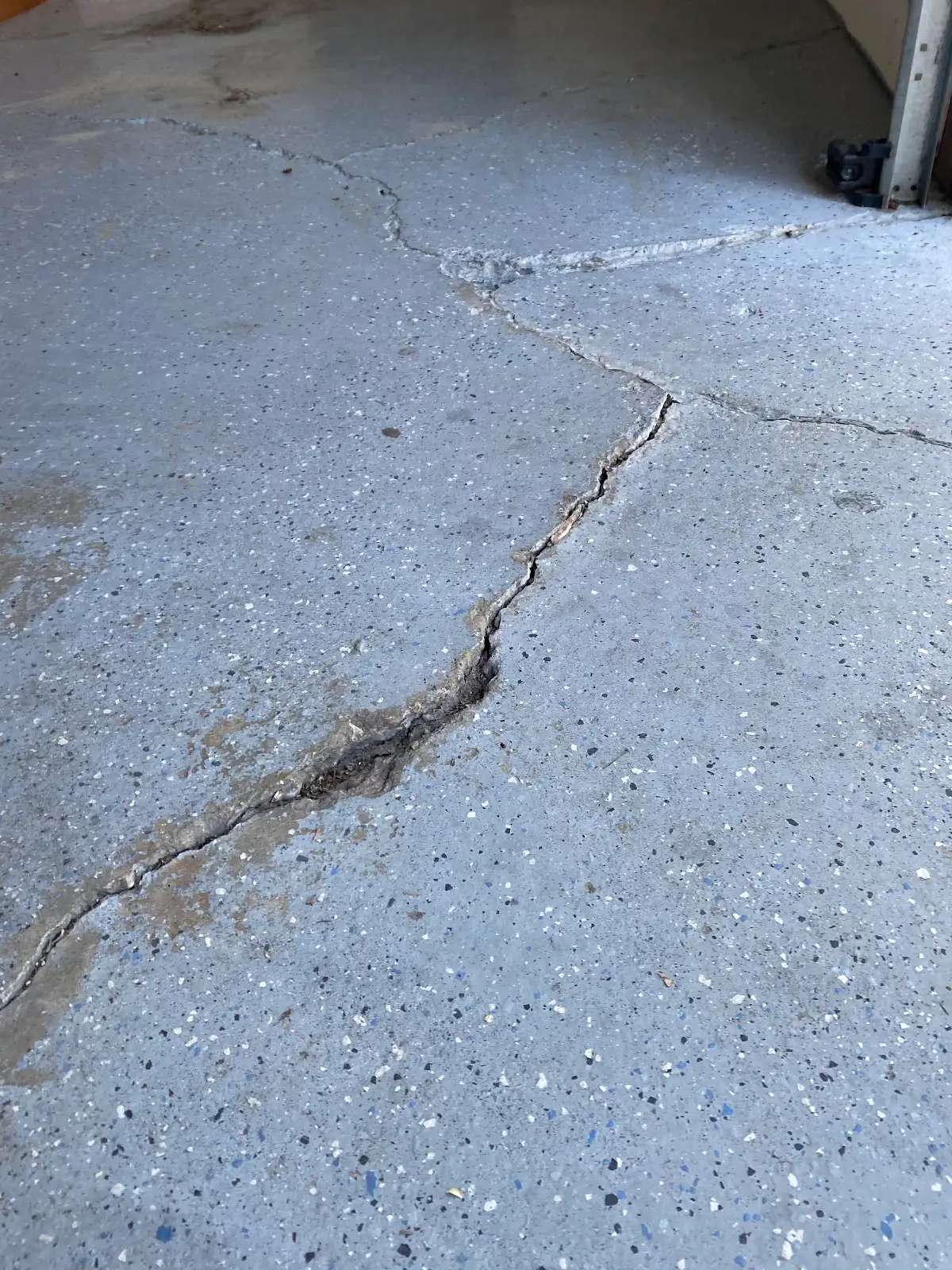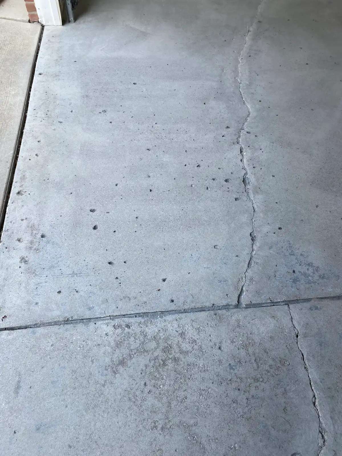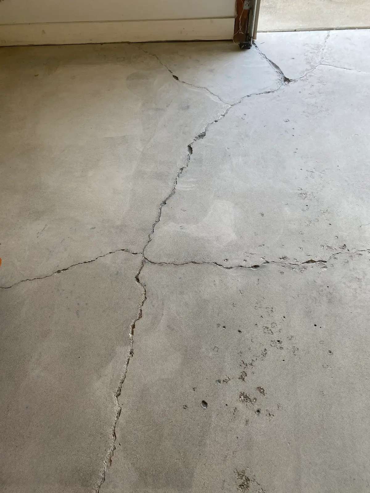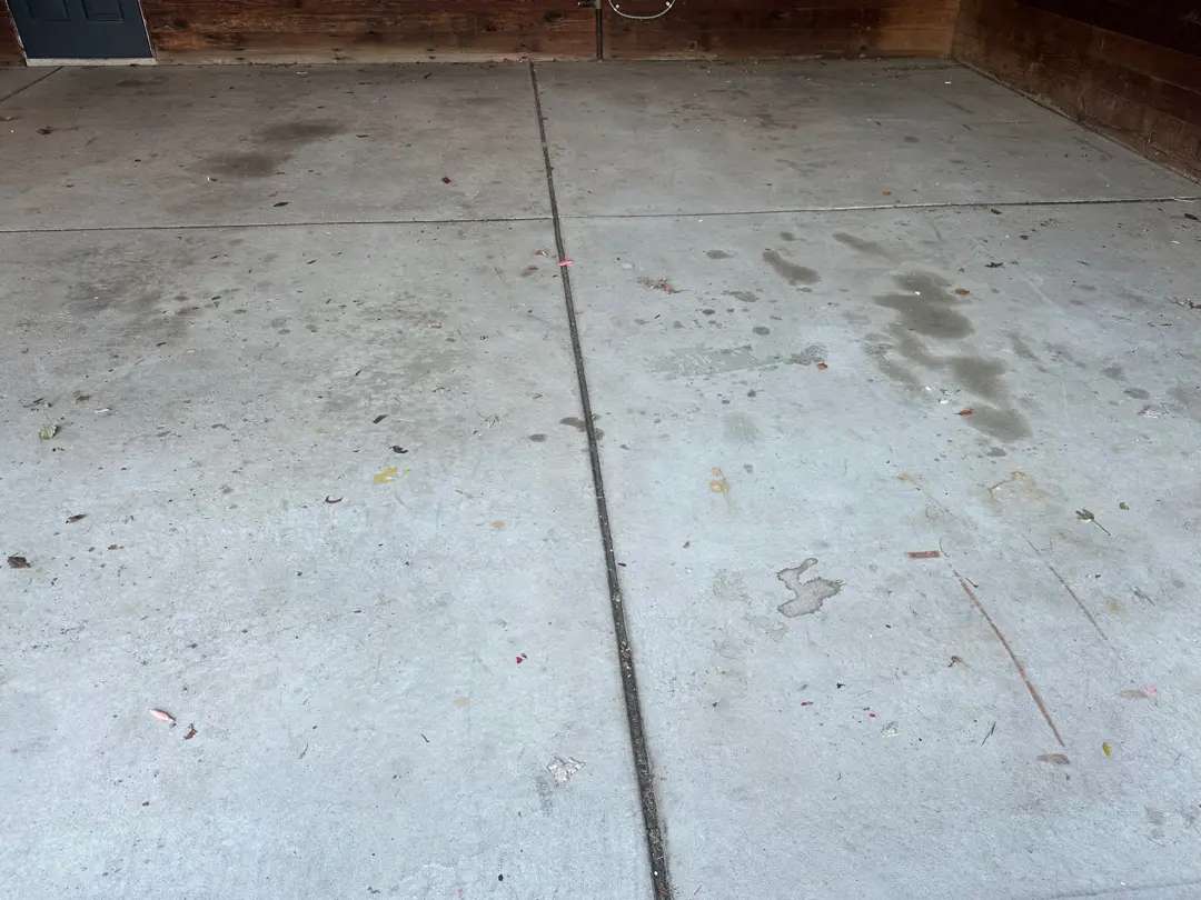This garage floor presented exceptional structural and surface challenges. Multiple structural cracks traversed the slab, several extending across the full garage width. These weren’t hairline fissures but substantial cracks exceeding 1/8 inch in width, some approaching 1/4 inch at their widest points. The crack patterns suggested both settlement movement and thermal stress cycling, with jagged propagation indicating tension failure in the concrete matrix.