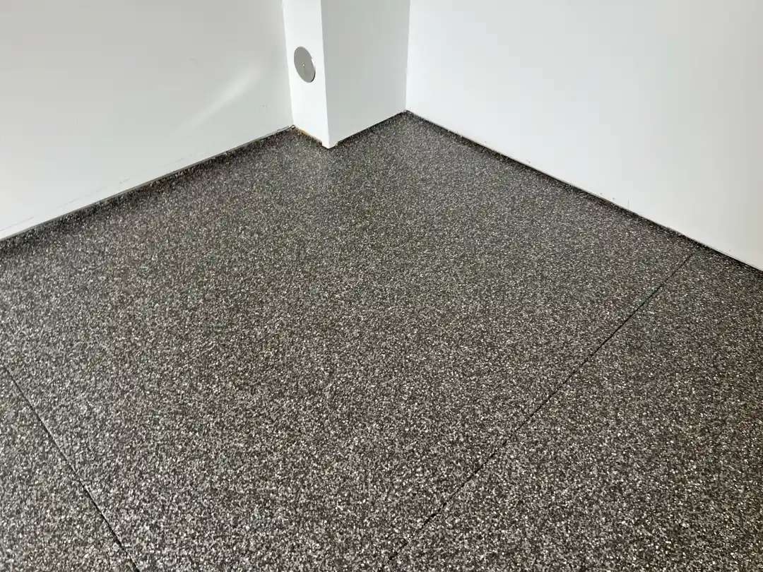 The flakes were broadcast to approximately 85-90% coverage density across all floor areas, creating the appearance of full coverage while allowing subtle glimpses of base coat color through small interstices between flakes. This density provides optimal visual impact while managing material costs and surface texture. The consistent flake coverage across all 1,090 square feet creates visual continuity throughout the multiple rooms, unifying the space into a cohesive whole.