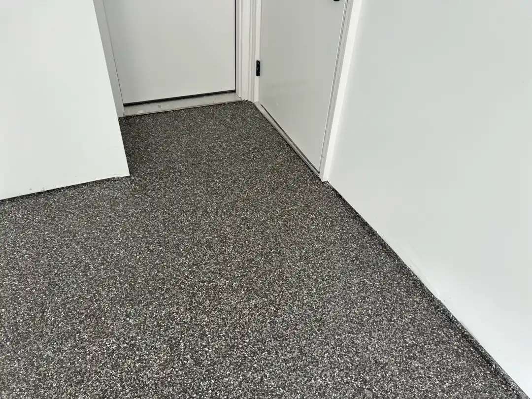 Our team applied the MC3.9 polyurea coating system in a two-tone design that creates visual interest and spatial definition. The main garage area received a dark charcoal base coat that would serve as the foundation for the Silver Creek flake blend. This deep, neutral tone provides excellent contrast for the decorative flakes.