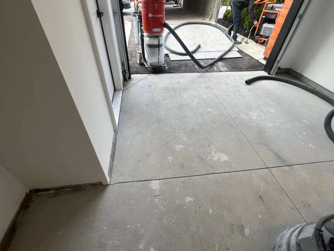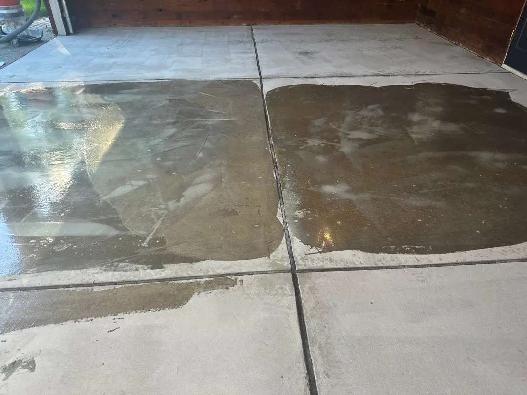 The grinding process proceeded systematically across all 1,090 square feet, with the team working in overlapping passes to ensure uniform profile depth and complete laitance removal. The control joints received detailed attention, with grinding equipment worked into joint channels to ensure proper profile and cleanliness for coating coverage. The absence of cracks, pits, or significant surface defects allowed our team to focus entirely on creating an optimal surface profile rather than dividing attention between preparation and repair work.
