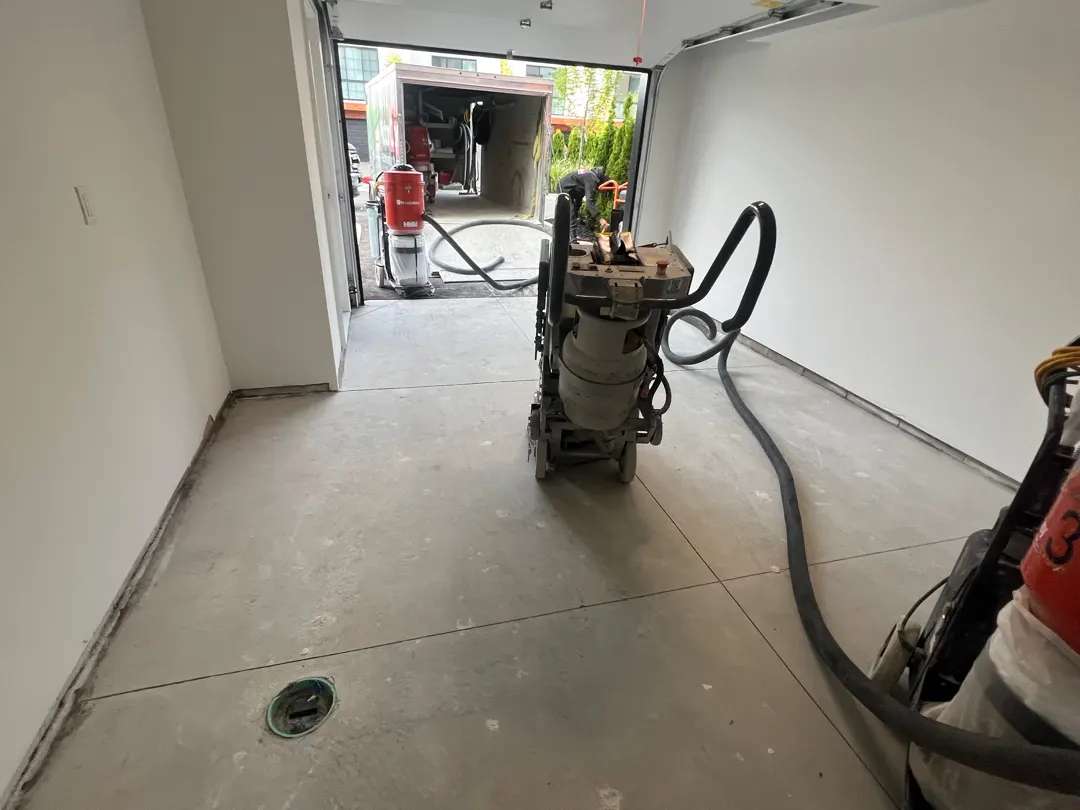 The installation commenced with the labor-intensive process of complete paint removal. This critical phase required aggressive mechanical methods using professional-grade diamond grinding equipment with coarse grit sequences specifically designed for coating removal. Our team systematically ground away all traces of the failed paint system, working across the entire 604-square-foot area to achieve complete removal down to bare concrete.