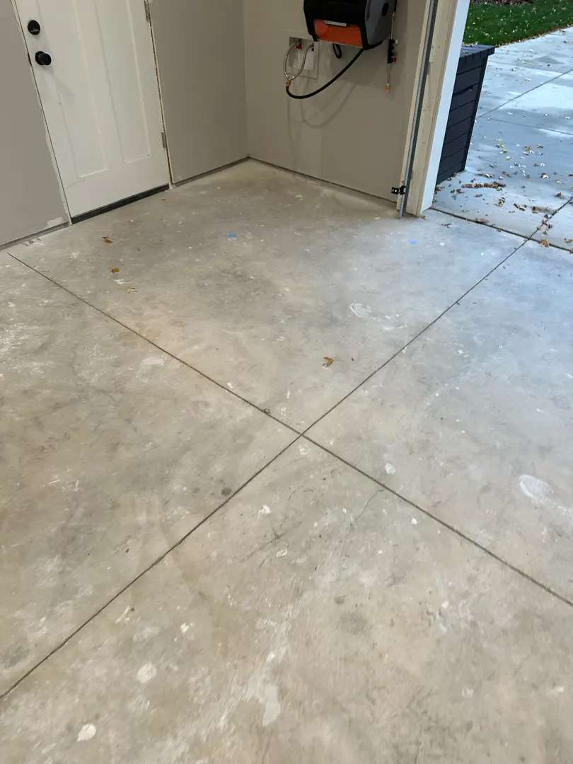 Minor drywall compound residue and construction debris were present—typical cosmetic issues from a recently completed home rather than substrate defects requiring repair. The concrete showed no moisture-related discoloration, efflorescence, or other indicators of hydrostatic pressure concerns that could compromise coating adhesion or long-term performance.